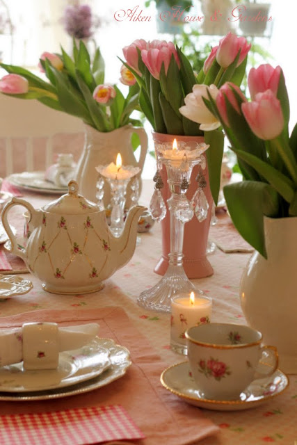 I used a mix of my pink vintage china along with pink linens(Thank you again Lauriane for the pretty placemats,I always remember our special afternoon in the garden when I use them). Lauriane and her husband from Rio de Janeiro were very special visitors to our garden last summer and you can read about it here.